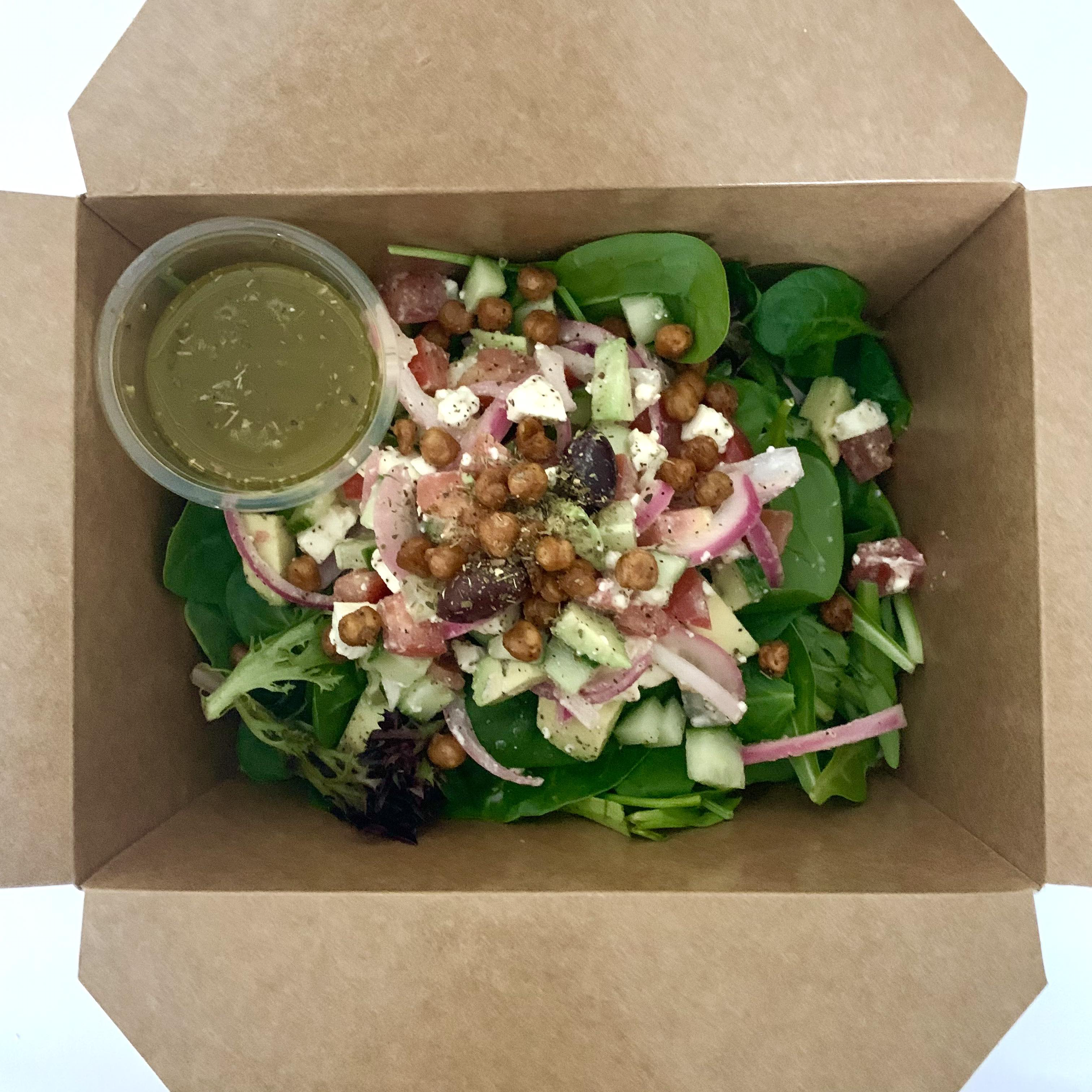 Mixed greens, feta cheese, pickled onion, tomato, cucumber, kalamata olives, avocado, toasted chickpeas, and a lemon oregano vinaigrette on the side.