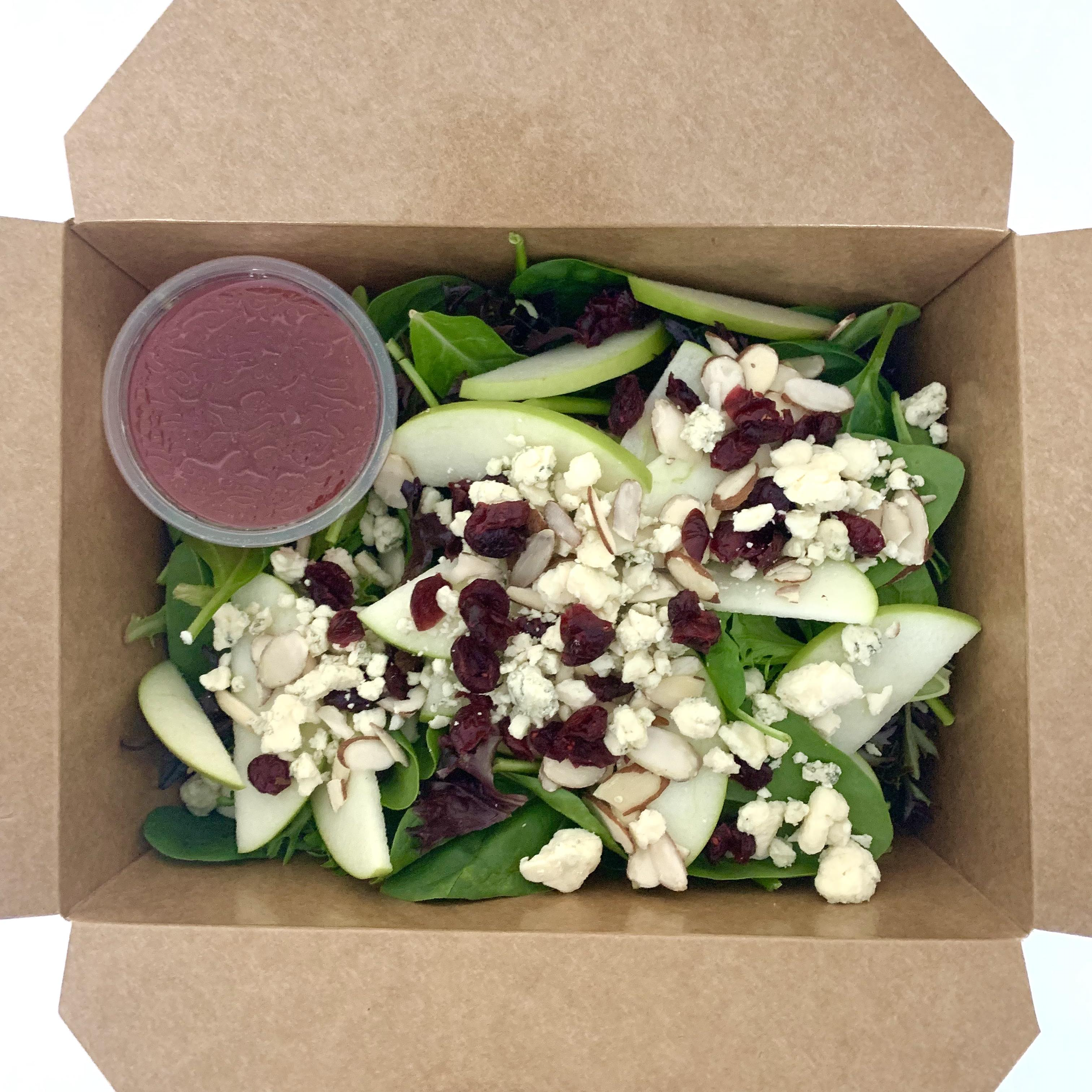Mixed greens, green apple, sliced almonds, dried cranberries, blue cheese, with a raspberry vinaigrette served on the side.