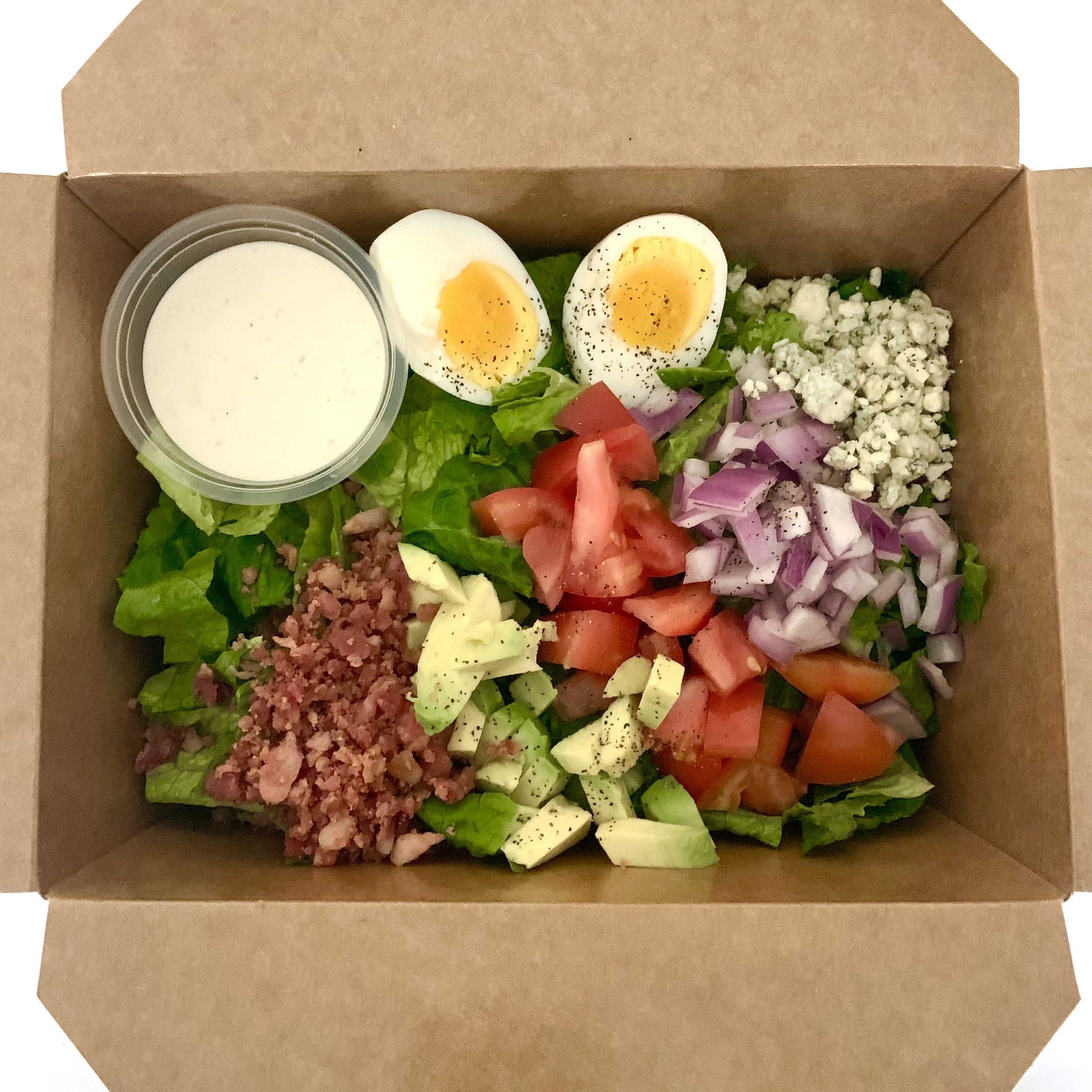 Chopped romaine lettuce, bacon, red onion, hard-boiled egg, tomato, avocado, and blue cheese with ranch dressing served on the side.
